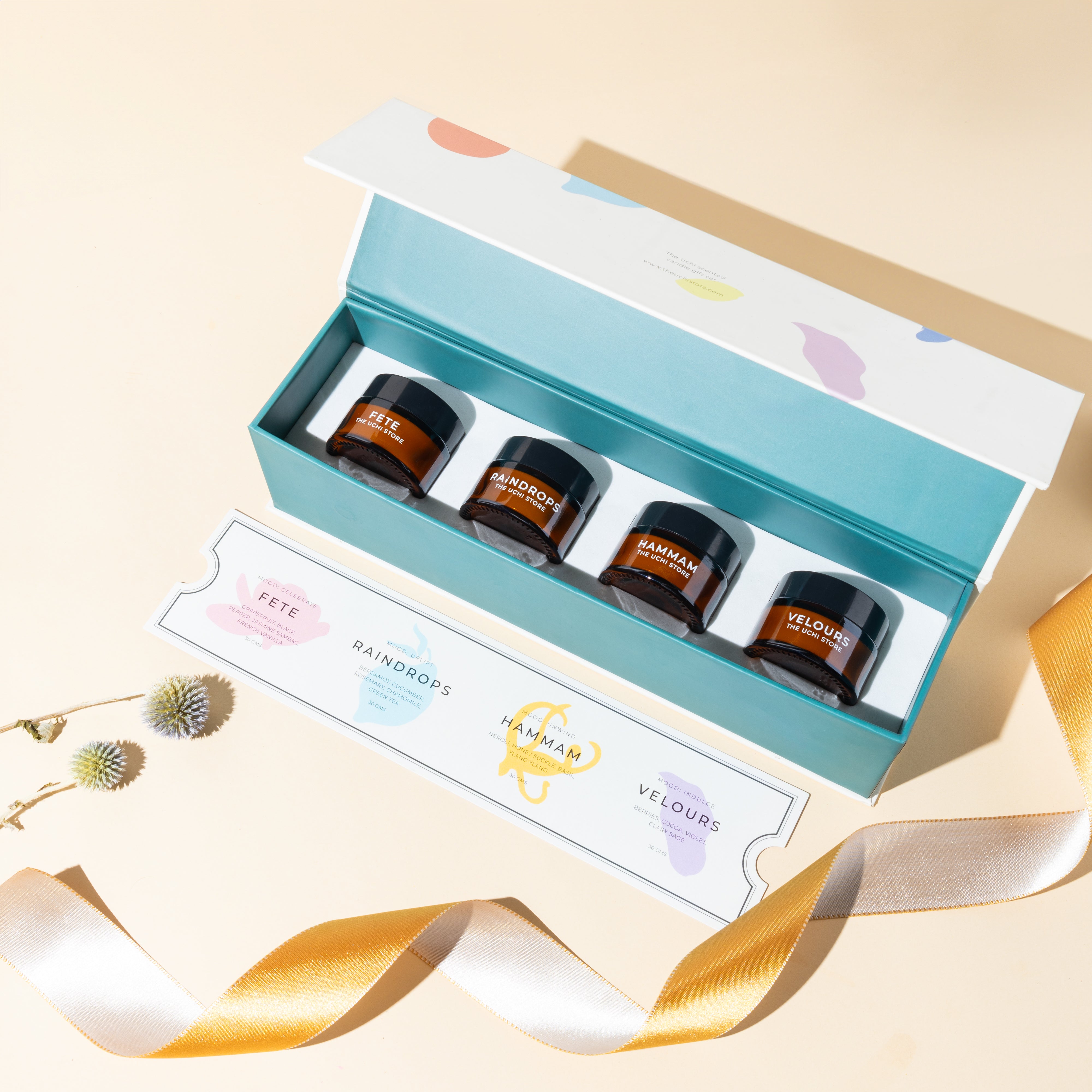 With modern yet festive packaging this gift set comes with 4 mini candles from each of our mood collections—so you don't have to go through the hassle of choosing. Whether you pick this for yourself or your loved ones be prepared for a unique sensory experience.